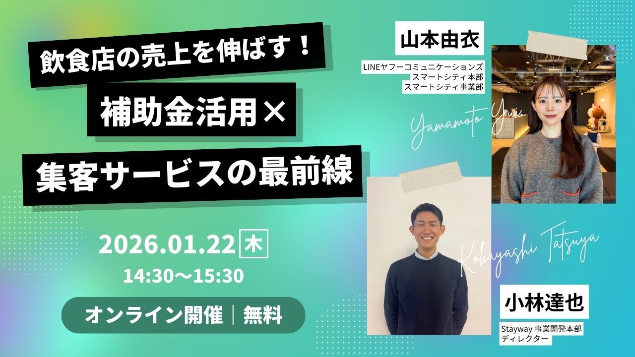 本セミナーでは、LINEヤフーコミュニケーションズと補助金クラウドが、飲食店の売上拡大に直結する「集客」と「補助金活用」の最新トレンドを一挙に解説します。本共催は、西日本FG主催のビジネスコンテストでの入賞をきっかけに両社が交流を深め、地域活性化という共通テーマのもと実現した取り組みです。LINEヤフーコミュニケーションズからは、他SNSと比べて“顧客との継続的な関係構築”に強みを持つ「LINE公式アカウント(OA)」の効果的な活用法や、そのOAと連携可能なマーケティング支援ツール「LINEスグミエール」の具体活用事例を紹介。さらに、補助金クラウドからは、2026年度の補助金動向と、飲食店が活用しやすい補助金やその成功事例などをわかりやすく解説します。集客力の強化と、投資に必要な資金確保の両面から売上アップを実現したい飲食事業者様に最適の内容です。