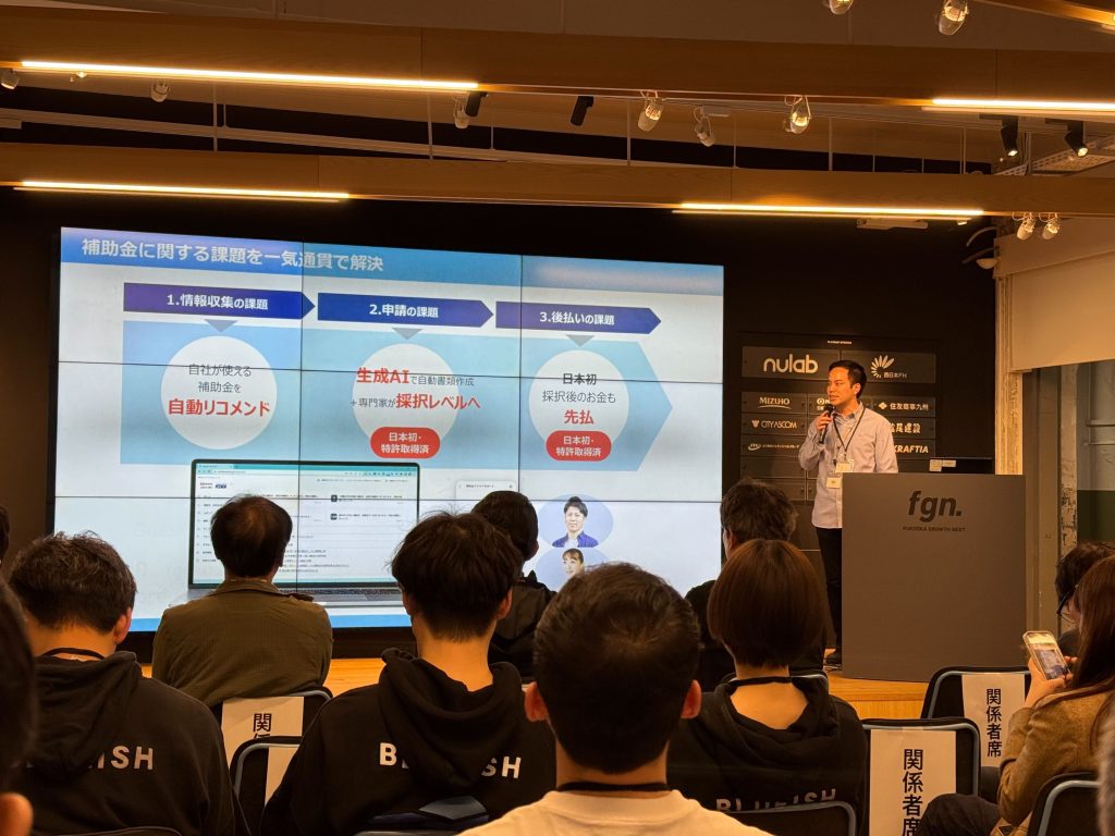 補助金クラウドは、西部ガス主催のアクセラレータープログラム「TOMOSHIBI」に採択されており、今回の成果発表会では、補助金クラウドを通じた新たなビジネスアイデアや、これまで福岡で取り組んできた実績について発表しました。
