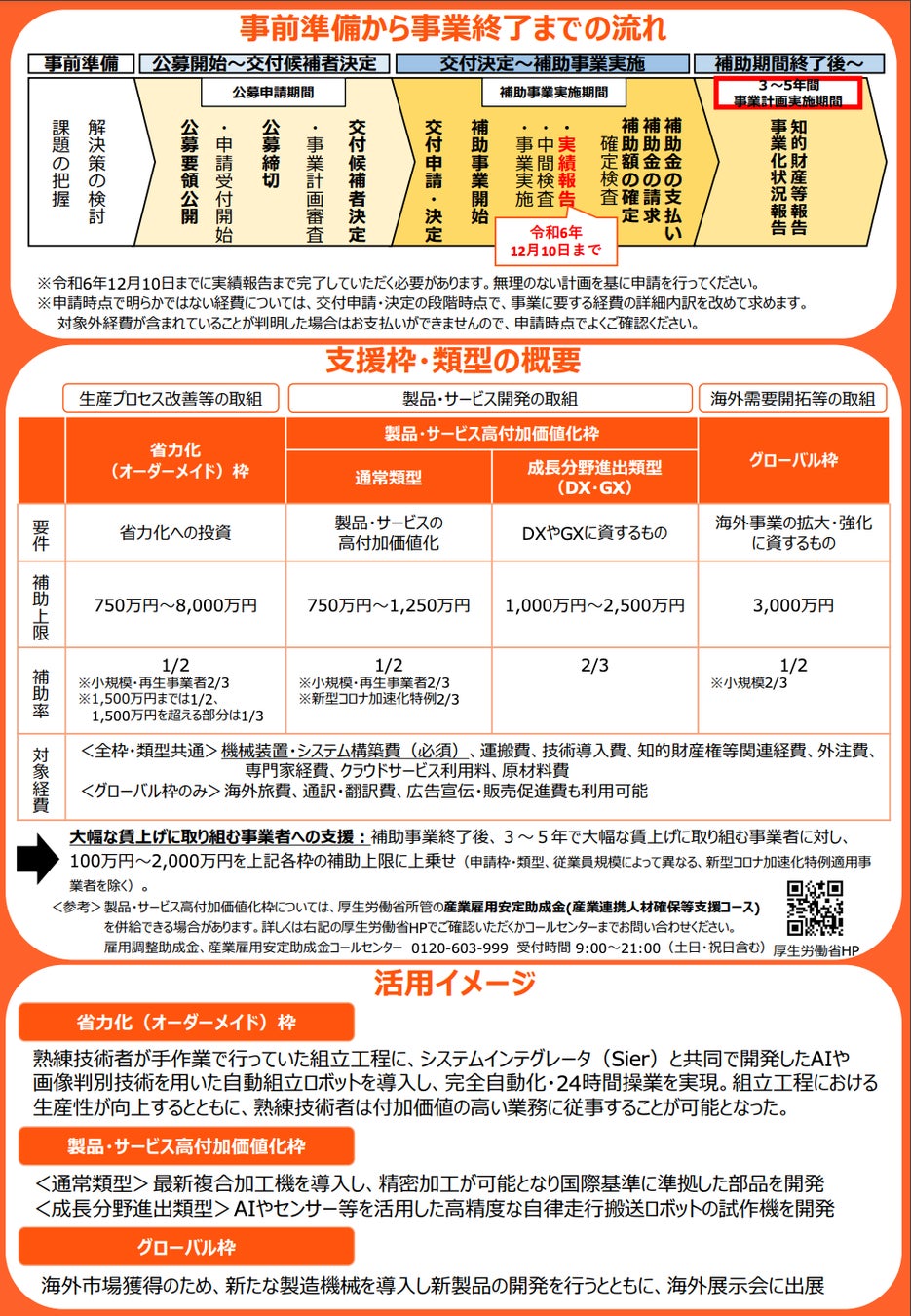 ものづくり補助金は、中小企業等が行う、革新的な製品・サービスの開発や生産プロセス等の省力化に必要な設備投資等を支援するものです。