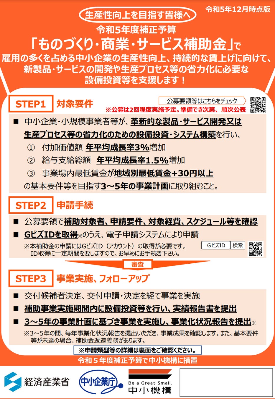 令和5年度の公募要領では「革新的サービス開発・試作品開発・生産プロセスの改善を行うための設備投資等を支援する」と記載されていましたが、令和5年度補正予算からは「改善」の代わりに「省力化」という単語が用いられ、生産性向上や持続的な売上拡大に向けた支援が強化されます。