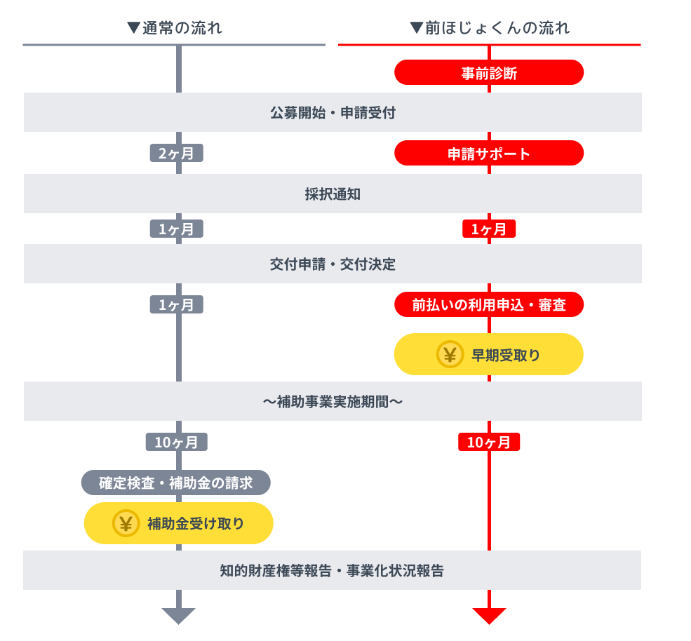 補助金の交付が決定した債権を提携金融機関グループに譲渡し、資金が提供される独自ソリューションにより、一部の補助金で早期受け取りが可能です。通常、補助金は補助事業実施後に交付されますが、「補助金クラウド for Startup」の搭載サービス「前ほじょくん」なら、交付申請・交付決定され、サービスの審査通過後に補助金を受け取ることが可能となり、事業資金の自己負担を軽減できます。ただし、現在試行期間中につき全てのお客様の要望に添えない可能性がございます。また、2023年12月19日現在は、ものづくり補助金のみ対応しております。