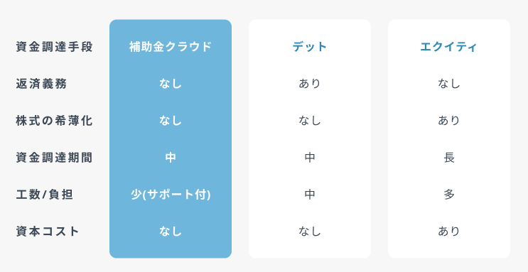 株主に対して出資金を返済しなければならないデットファイナンスや、株式市場の低迷による株式の希薄化が課題として挙げられるエクイティファイナンスのデメリットを解消した資金調達手段が「補助金クラウド for Startup」です。
